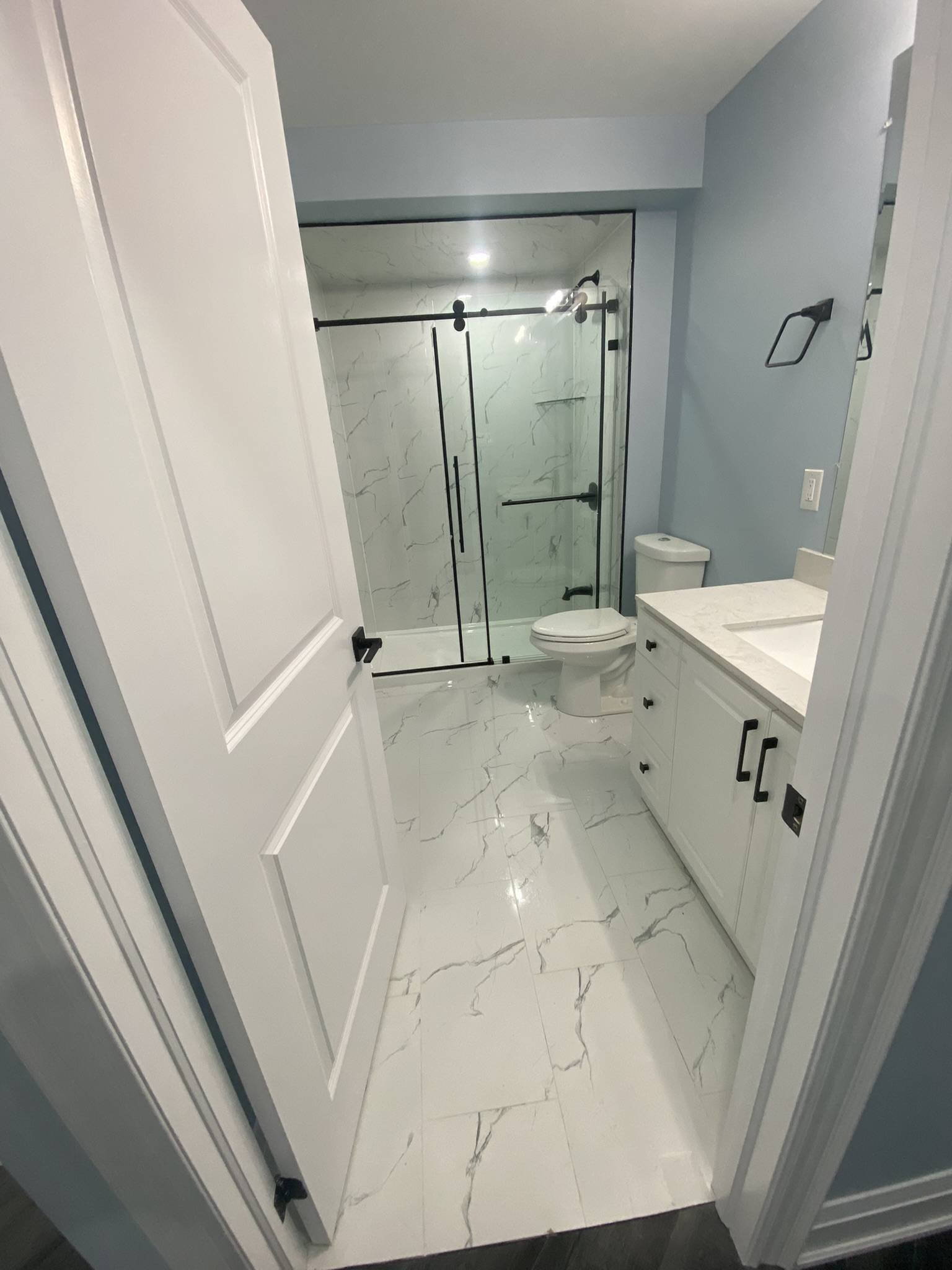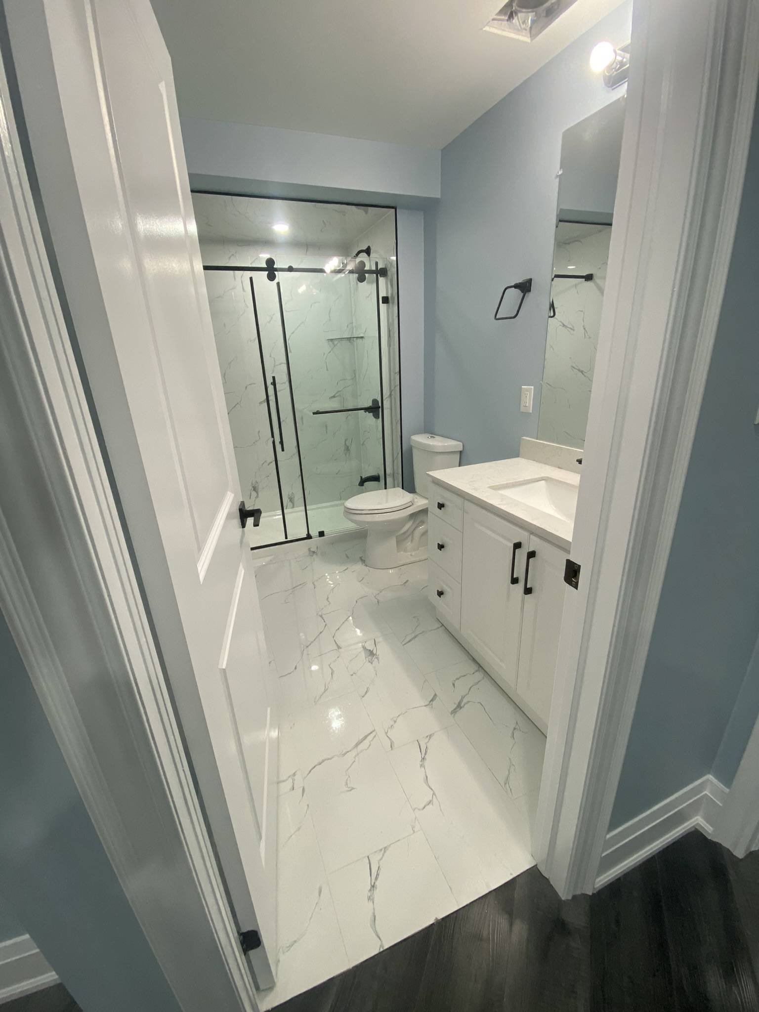 All Reno Solutions completed a modern and elegant bathroom remodelling project at 95 Sarcini. Our team transformed the space with upgraded fixtures, refined finishes, and a more functional layout. This renovation highlights our dedication to quality workmanship and our commitment to delivering beautifully designed, long-lasting bathroom spaces.